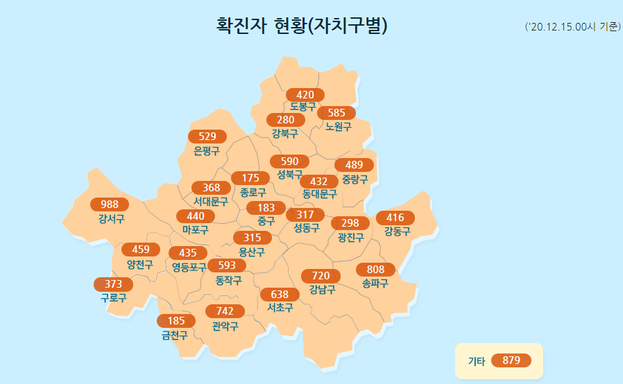 서울의 코로나19 확진자 현황입니다. 서울전지역에서 코로나19 신규 확진자가 나오고 있는 상황인데요. 사회적거리두기 2.5단계인데도 좀처럼 신규확진자수가 줄어들 생각을 않하고 있습니다. 수도권지역의 학교에서도 신규학진자가 많이 나오면서 학교들도 온라인수업으로 전환하고 있습니다.