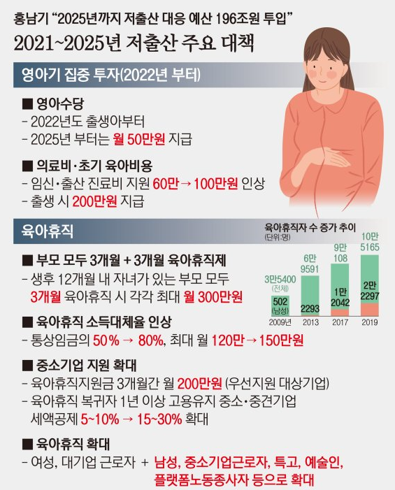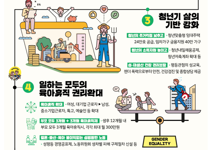 육아휴직을 보편적 권리로 확립하기 위해 정부는 급여소득자뿐만 아니라 특수근로자, 예술가, 플랫폼근로자, 프리랜서, 자영업자도 사용할 수 있도록 대책을 마련하기로 했다.