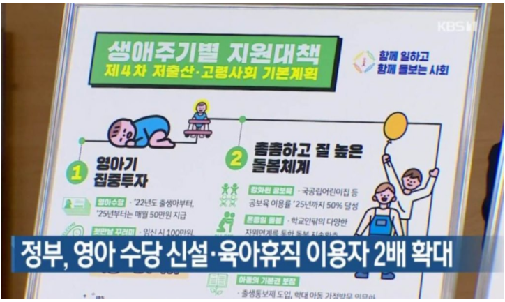 정부는 오늘 저출산. 고령사회 기본계획을 발표했는데요 저출산.고령사회 기본계획에 보면 2022년부터 0세~1세의 영아에게 영아수당으로 월 30만원을 지급하고 금액을 2025년까지 50만원으로 인상한다는 계획을 발표했는데요 지금부터 저출산. 고령사회 기본계획의 자세한 내용을 알아보도록 하겠습니다.