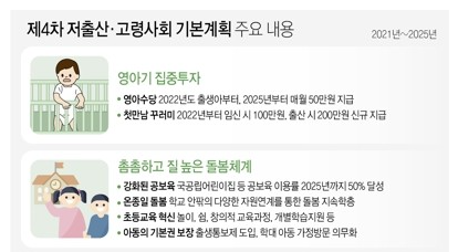 정부에서 추진하는 2021년~2025년까지 저출산과 고령사회의 문제를 해결하기 위한 기본계획을 말합니다. 영아 시기부터 노년에 전연령대에 정부에서 지원해주는 계획입니다.