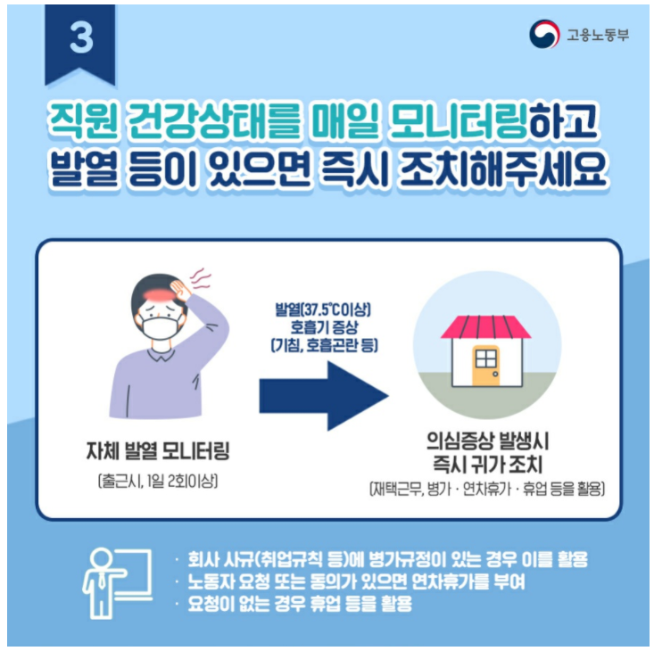 직장근무 : 기관, 부서별 재택근무 등 확대 권고, 고위험사업장 마스크 착용, 환기,소독, 근로자 간 거리두기 등 의무화