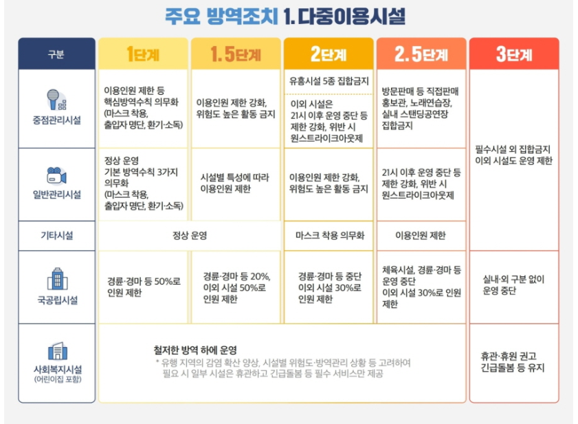 사회적 거리두기 단계별 기준 및 방역조치 사항