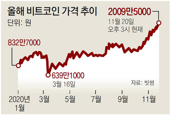 최근 비트코인 시세의 그래프를 보면 2020년 3월 최저가격인 639만1000원까지 떨어져서 가상화폐의 거품이 다빠져버리는구나 싶었는데 최근 가파르게 상승하면서 2009만5000원까지 오르면서 장밋빛 전망을 내다보고있습니다. 글로벌 금융회사들이 최근 잇달아 가상화폐 거래서비스에 뛰어들면서 국내외 비트코인 시장이 달아오르게 되었다는 분석입니다.